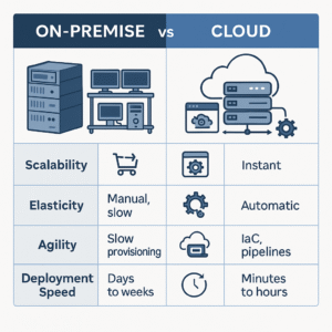 | Agility | Slower due to hardware provisioning, change processes, and siloed teams. | High agility with automation, IaC, containers, and rapid provisioning. |